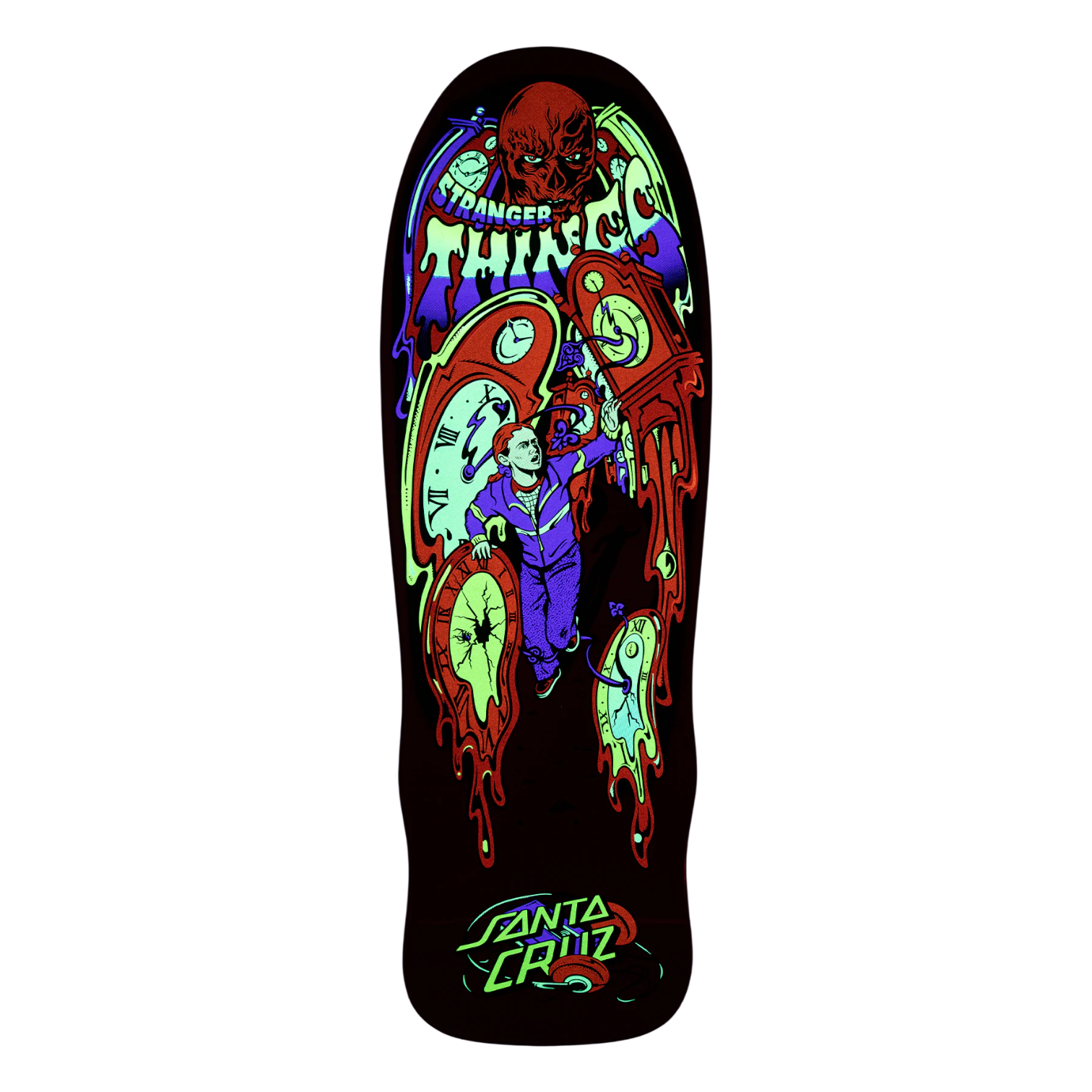 The Santa Cruz Stranger Things Grabke Max Melting Clock 9.7in x 29.4in deck features multicolor glow in the dark graphics on Claus Grabke's classic Melting Clock shape.